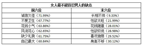 蝴蝶网时尚论坛(这个论坛的用户几乎是清一色爱好时尚的年轻女性)的一项调查显示,在问到“男生的20个常见缺点,看看哪些是你的绝不容忍?”时,反馈如下表: