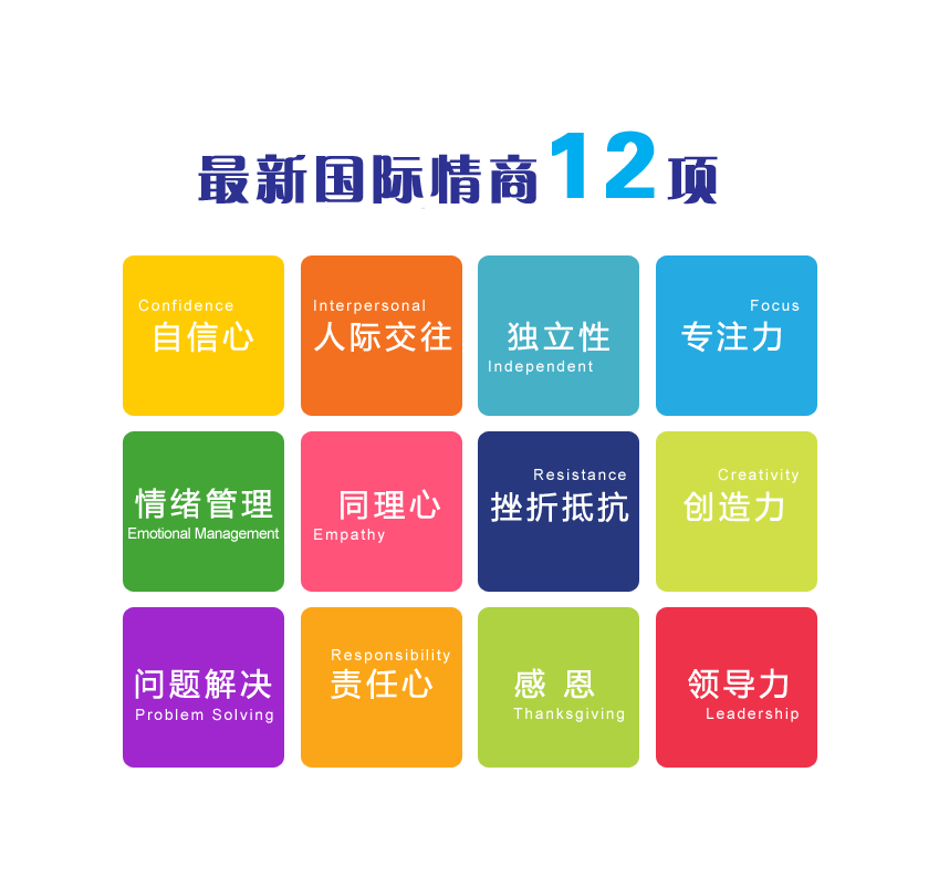 1.最新国际情商12项能力训练:专注力、情绪管理、同理心、创造力、问题解决、自信心、协作力、执行力、领导力、时间管理能力、计划与目标管理等;